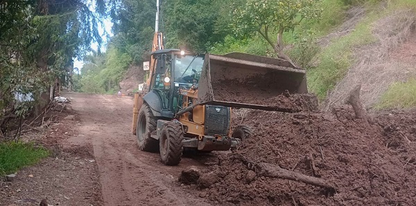 En Yahualica se trabaja en un derrumbe en la carretera estatal Nuevo Acatepec – Atlalco – Oxeloco a través de una excavadora a cargo de la Secretaría de Infraestructura Pública Comunicaciones y Transporte (SICT).