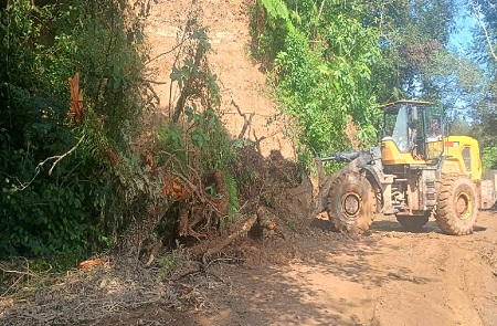 Se desalojaron mil 300 m³ de derrumbes en la carretera estatal Tlanchinol – Apantlazol – Olotla, del kilómetro 11+300 al 11+800, con apoyo de un cargador frontal.