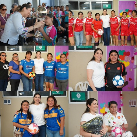 Posteriormente, en instalaciones del DIF Municipal, la Dra. recibió a las comitivas representantes de la Liga de Fútbol Femenil nombrada en su honor, a quienes realizó la donación de balones y portería para los próximos partidos. «Su ejemplo es un orgullo para nuestro municipio, su pasión y su determinación son fuente de inspiración para otras mujeres, niñas y jóvenes”, destacó. En este espacio, el presidente Alfredo San Román felicitó a las jóvenes por su participación activa en el deporte, instándolas a luchar por sus sueños y anhelos en sus diferentes facetas. Mientras tanto, agradeció el respaldo, motivación y trabajo en equipo de los padres y madres de familia hacia sus hijos, invitándoles a colaborar en la restructuración del tejido social con las nuevas y futuras generaciones, señalando que su gobierno seguirá fomentando estos espacios familiares son fundamentales para el bienestar y desarrollo de la población.