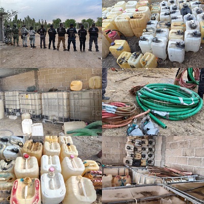 Durante el cateo, las autoridades aseguraron 19 mil 55 litros de hidrocarburo, 127 contenedores, dos bombas hidráulicas y 11 tramos de manguera.