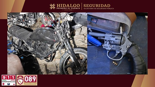 En la colonia Jorge Rojo Lugo, elementos de la SSPH aseguraron 72 dosis de presunta droga entre marihuana y cristal, además de una pistola calibre .22 y una motocicleta sin placas de circulación presuntamente utilizada para estas actividades.
