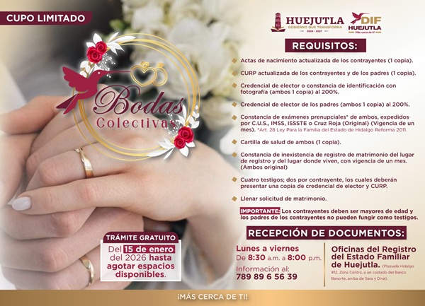 El Sistema DIF Huejutla, presidido por Kristel Rodríguez Flores y el Gobierno Municipal que encabeza Alfredo San Román Duval, invitan a la población mayor de 18 años, que desee voluntariamente unirse en matrimonio, a participar en el registro de Bodas Colectivas 2026, que se celebrarán el próximo mes de febrero.