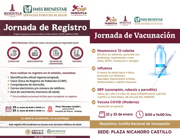 Con el propósito de acercar a la población el acceso a la seguridad social y a los servicios de salud, el Sistema DIF Huejutla, presidido por Kristel Rodríguez Flores y el Gobierno Municipal que encabeza Alfredo San Román Duval, invitan a la ciudadanía que no cuenta con derechohabiencia en IMSS ordinario, ISSSTE, Sedena y PEMEX, a participar en la Jornada de Registro IMSS-Bienestar, que se llevará a cabo los días 22 de enero de 8:00 de la mañana a 3:00 de la tarde y el 23 de enero de 8:00 de la mañana a 2:00 de la tarde, en la Plaza Nicandro Castillo de la zona Centro.
