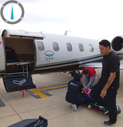 El traslado inició en ambulancia desde el hospital hasta el Aeropuerto Internacional Felipe Ángeles (AIFA), donde la menor fue acompañada durante todo el vuelo por un equipo médico especializado, conformado por una doctora y un técnico en urgencias médicas, quienes se encargaron de su monitoreo y cuidado constante.