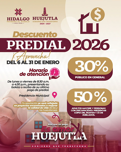 El Gobierno Municipal de Huejutla de Reyes informa a la ciudadanía que se encuentra vigente el Programa de Descuento en el pago del Impuesto Predial 2026, el cual estará disponible del 6 al 31 de enero.