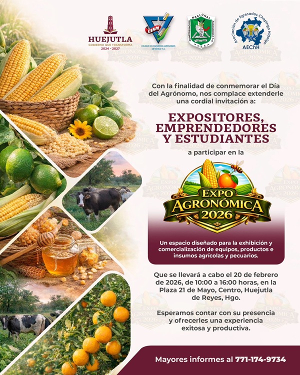 El evento se llevará a cabo el próximo 20 de febrero de 2026, en un horario de 10:00 a 16:00 horas, en la Plaza 21 de mayo, en la zona centro de la ciudad de Huejutla de Reyes. La Expo es organizada en coordinación con el Colegio de Ingenieros Agrónomos de México A.C., la Confederación Nacional Agronómica y la Asociación de Egresados Chapingo Hidalgo, sumando esfuerzos institucionales para ofrecer un espacio destinado a la exhibición y comercialización de equipos, productos e insumos agrícolas y pecuarios.