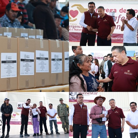 El gobernador de Hidalgo, Julio Menchaca Salazar, acompañó la primera entrega de apoyos económicos que arrancó en los municipios de Metztitlán y Zimapán, por parte del Gobierno de México a favor de las familias que resultaron afectadas por las lluvias torrenciales en la entidad.