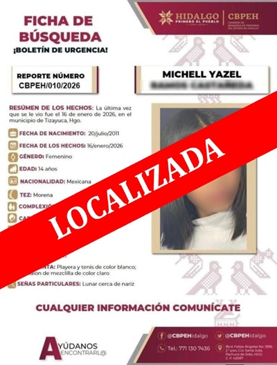 Como resultado de una respuesta operativa eficiente y el seguimiento puntual de los protocolos establecidos, la Secretaría de Seguridad Pública de Hidalgo (SSPH) logró la localización de la menor Michell Yazel R.C., quien contaba con un reporte de desaparecida.