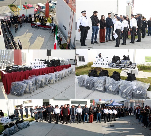 En su intervención, el titular de la Secretaría de Seguridad Ciudadana, Jorge Alberto Trejo Terrazas, informó que se entregaron fornituras, chalecos tácticos, cámaras de solapa, mochilas tácticas, chalecos balísticos, cascos balísticos, gogles tácticos, juegos de coderas, juegos de rodilleras, candados de mano, bastón policial PR–24 y lámparas de mano, para 280 elementos.