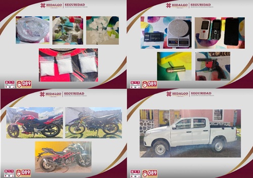 El operativo permitió también el aseguramiento de 240 dosis de presunta marihuana, 140 dosis de sustancia granulada con características del cristal, dos básculas, diversas pipas de cristal y un arma corta de fabricación artesanal junto con un cartucho útil calibre 22. También fue decomisada una motocicleta, presuntamente utilizada para los actos delictivos.