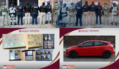 Durante el primer punto, ubicado en una joyería de la colonia Centro, se aseguraron 120 dosis de hierba verde seca con características propias de la marihuana, 63 dosis de presunto cristal, una báscula gramera, un teléfono celular, un vehículo y fueron detenidas tres personas, dos mujeres y un hombre que responden a las iniciales A.G.O.G., G.F.G.G. y C.S.C., presuntamente relacionadas con actividades de narcomenudeo.